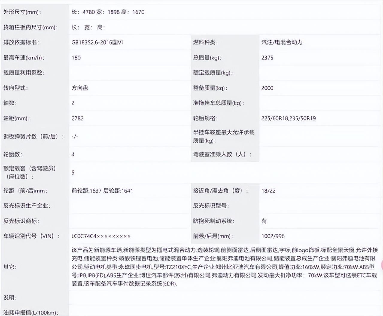 當然大家比較關心的,可能還是這款車的尺寸,相比于宋L純電車型,宋L DM-i的尺寸可能會略小一點。申報信息給出的長寬高尺寸為4780/1898/1670mm,軸距為2782mm,放在王朝網(wǎng)內(nèi)部產(chǎn)品體系下,這款車的長度,介于宋Pro DM-i和宋L純電車型之間,讓人不得不感嘆,比亞迪的產(chǎn)品網(wǎng)絡“編制”之密集。