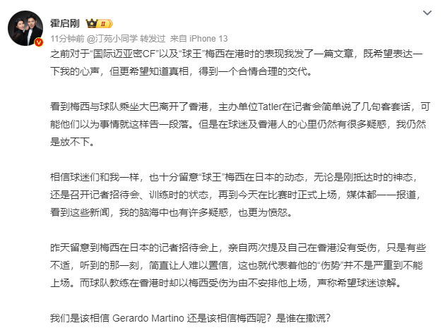 2月7日,霍啟剛二度發(fā)文談梅西風波,這用詞更加犀利,仍堅持要讓梅西和邁阿密國際道歉。