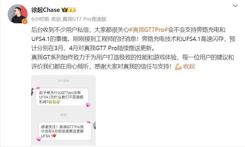 好消息是真我中國區總裁透露,真我GT7 Pro也將支持UFS 4.1和旁路充電,預計會在四月份陸續推送更新包,也就是說在硬件上面真我GT7 Pro支持UFS 4.1和旁路充電,但之前沒有開啟,后續可以通過OTA更新來實現,不愧是萬物皆可OTA。