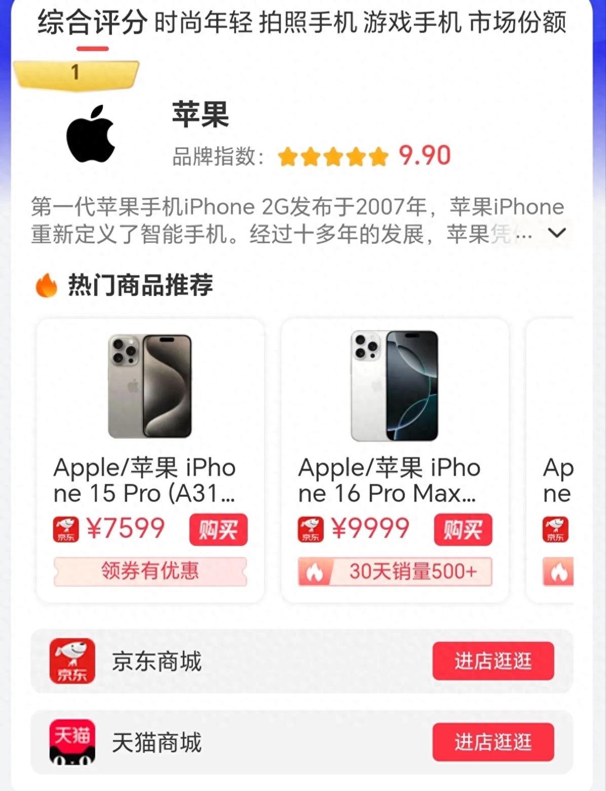 蘋果以 9.90的品牌指數(shù)穩(wěn)居榜首,iPhone系列更是憑借其強(qiáng)大的性能和流暢的系統(tǒng)體驗(yàn),俘獲了無(wú)數(shù)果粉的心。從 2007年第一代iPhone橫空出世,到如今 iPhone 15 Pro的強(qiáng)勢(shì)登場(chǎng),蘋果始終引領(lǐng)著智能手機(jī)的發(fā)展潮流。7599元起的售價(jià)雖然不菲,但依然擋不住消費(fèi)者的熱情,30天銷量500+的成績(jī)就是最好的證明。