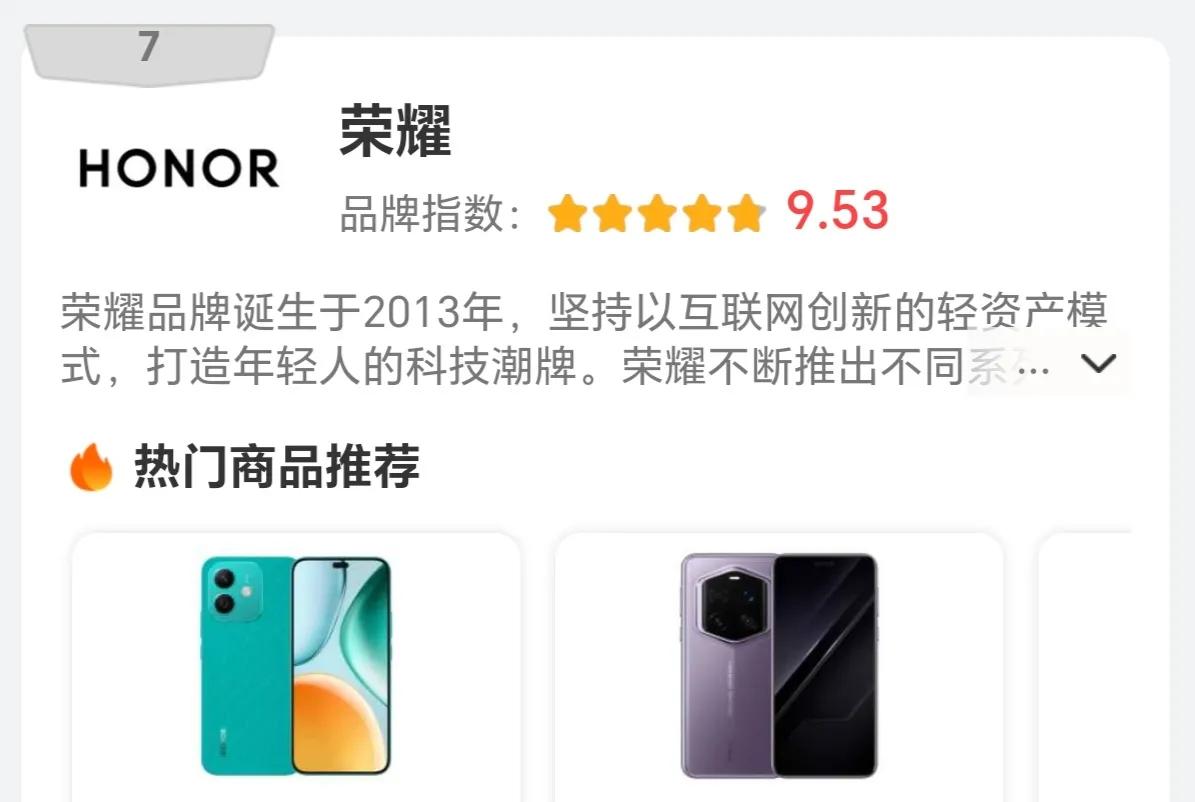 榮耀以 9.53 的品牌指數(shù)位列第七,作為華為曾經(jīng)的子品牌,榮耀始終堅(jiān)持獨(dú)立發(fā)展,致力于打造年輕人的科技潮牌。雖然目前榮耀的產(chǎn)品線還不夠豐富,但其未來(lái)的發(fā)展?jié)摿Σ蝗菪∮U。