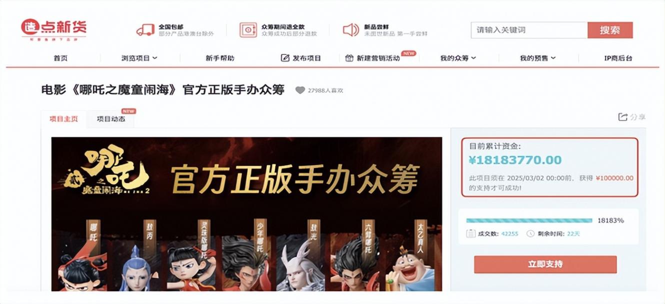 除了盲盒外,其他周邊商品也表現不俗。獲得官方授權的卡游官方旗艦店、集卡社旗艦店推出的《哪吒之魔童鬧?!分苓吙ㄅ仆瑯邮艿较M者的熱烈追捧。僅一周時間,相關卡牌便賣出超過70萬張,累計成交額突破百萬元。其中,卡游限量發售的餃子導演親筆簽名卡更是成為眾多粉絲心中的“圣物”。此外,淘寶平臺上還涌現出眾多由粉絲自發發起的周邊眾籌項目。例如,FunCrazy塑料主義、阿里魚旗下品牌“造點新貨”等商家發起的《哪吒2》周邊眾籌項目,目標籌款10萬元,但目前在淘寶上已經眾籌到了超過1800萬元。這一數字不僅超出了預期目標,也進一步證明了哪吒IP的商業價值。