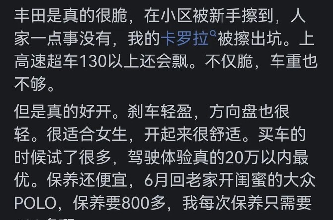 當然,也有人覺得豐田車的設計和配置有些跟不上時代。與國產車的高科技配置和時尚外觀相比,豐田的內飾設計確實顯得有些保守。一些車主吐槽說,豐田車的配置“摳摳搜搜”,很多功能都需要選配。同樣價位的國產車,可能已經配備了更大的屏幕、更智能的交互系統和更多的舒適性配置。在這一點上,豐田確實需要加把勁。