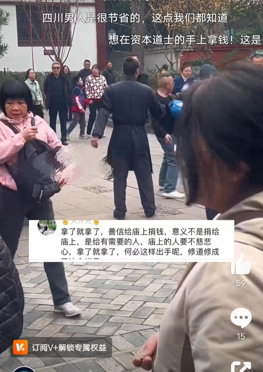 2月15號,成都青羊宮,一名游客拿了游客扔在許愿池里的錢,被道長抓住,游客歸還了道長還不依不饒。