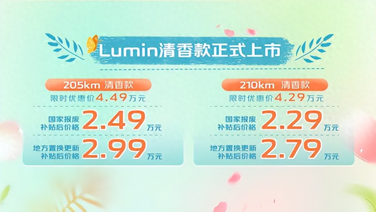 其中,205km版本限時優惠價為4.49萬元,享受國家報廢補貼2萬元后,購車指導價低至2.49萬元,若享受地方置換補貼1萬元,指導價為2.99萬元。