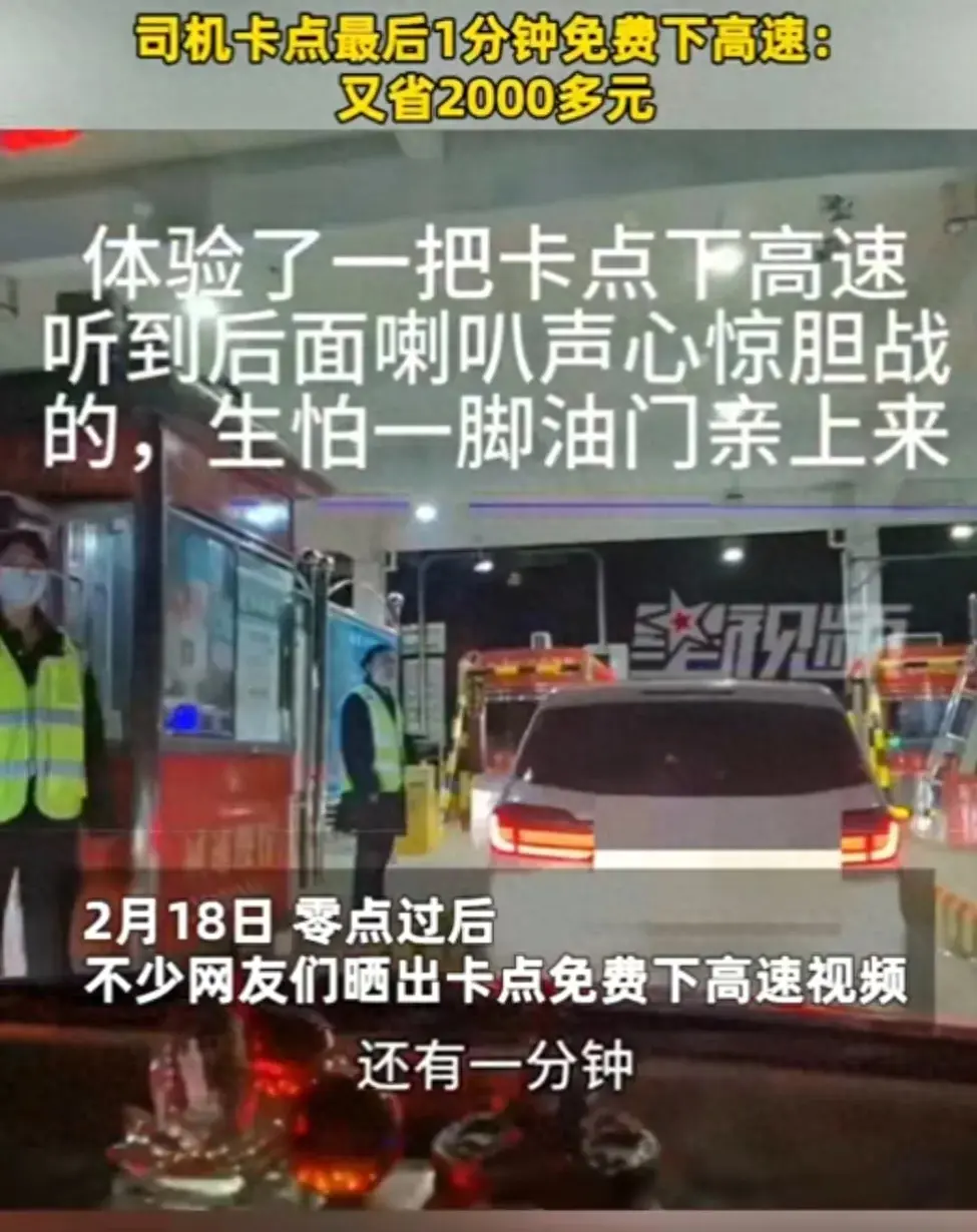 視頻顯示,高速上一路堵車,免費的最后時刻,喇叭到處響,有幸最后1分鐘過收費站的司機,激動的直呼:卡點出來又省了兩千多。