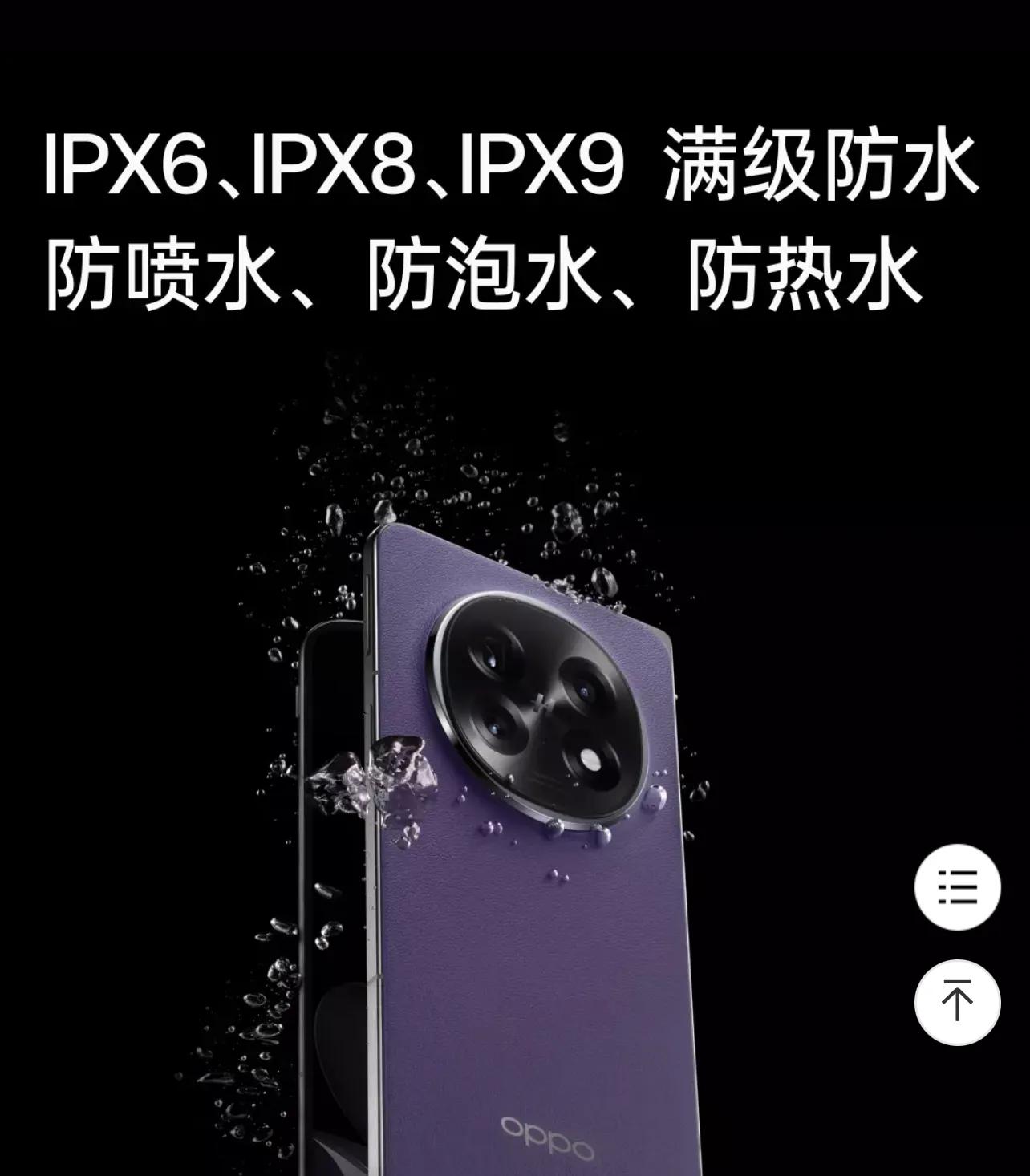 OPPO Find N5是全球首款擁有IPX6(防高壓噴水)、IPX8(可在水下2米浸泡)、IPX9(耐受高溫蒸汽)三重認證的折疊屏手機!經過實測,在淋浴時刷劇、在溫泉池邊回復消息都毫無問題,甚至在水下1.5米的環(huán)境中拍攝30分鐘,手機依然能正常使用。據OPPO工程師介紹,鉸鏈內部使用了納米疏油涂層,連水蒸氣都很難滲透進去。