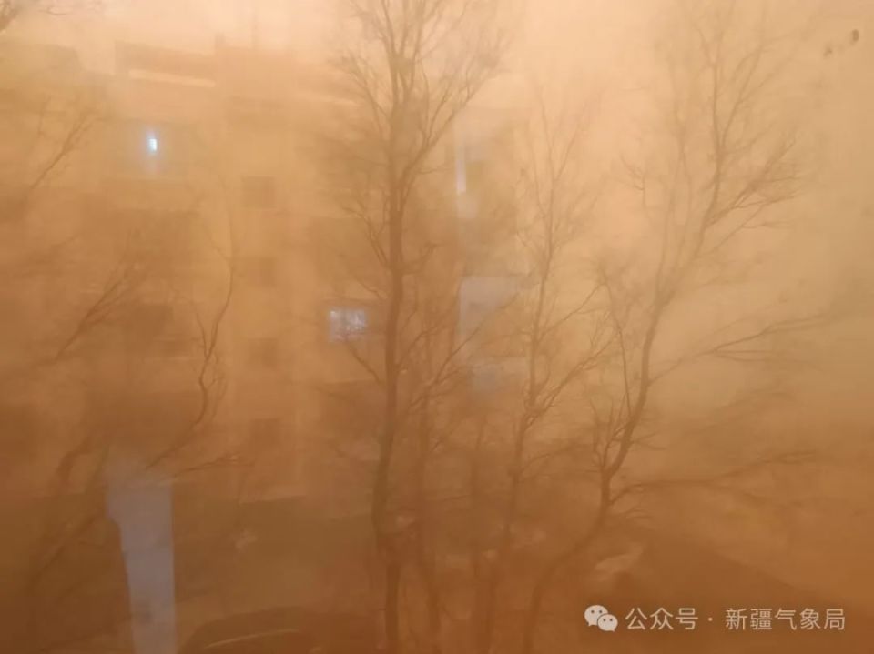 2月17日,多名網友拍下新疆特強沙塵暴,天空呈赤橙色。