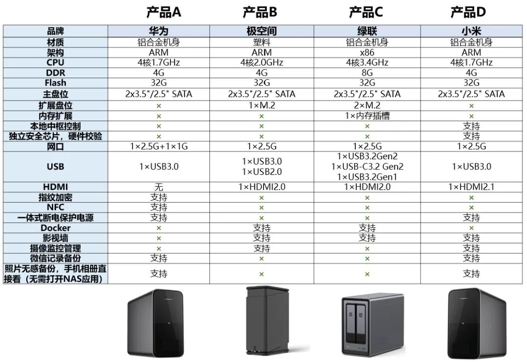 在產(chǎn)品對(duì)比中,也出現(xiàn)了華為,極空間,綠聯(lián)等友商競(jìng)品。目前,x86架構(gòu)、ARM架構(gòu)均在調(diào)研范圍內(nèi),應(yīng)該是還沒(méi)有完全確定下來(lái),另外均不支持Docker。