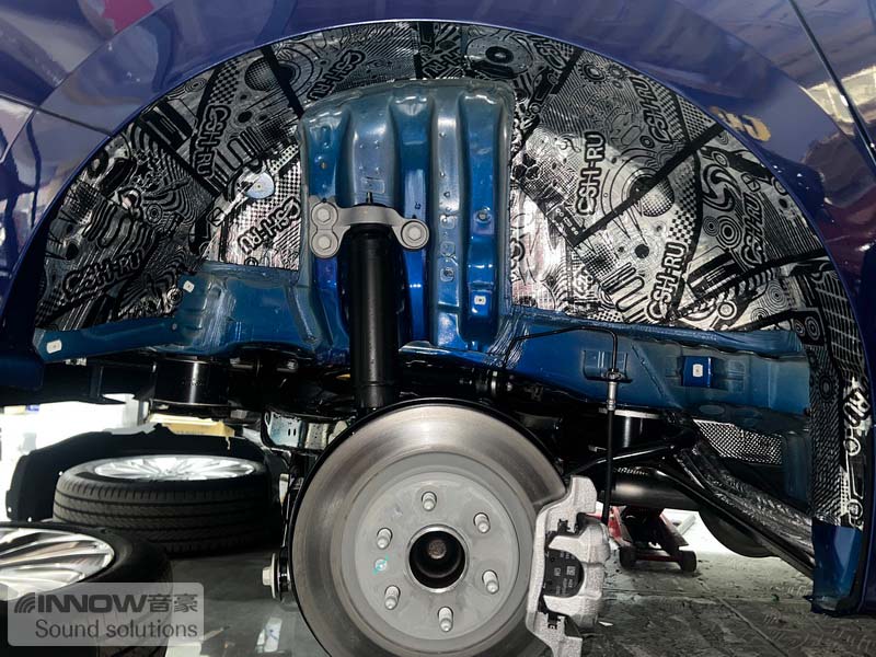 拆掉汽車的四輪翼子板飾板以后,映入眼簾的是光禿禿的鐵皮結構,路噪和胎噪可以輕易的傳入到車廂內部。技師先使用CSH小炸彈對四輪翼子板做止振處理,一方面可以減少鈑金振動的產生,另外一方面也能夠增強翼子板處的密封性。
