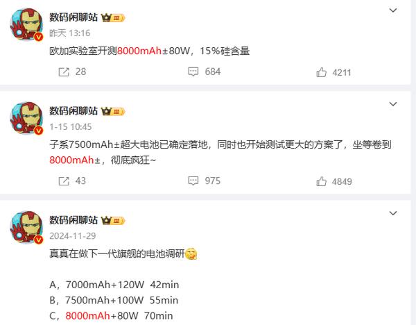 OPPO和一加也不甘示弱,據業內人士透露,歐加實驗室正在對一款配備8000mAh大容量電池及80W有線充電技術的續航系統進行測試。該系統采用了15%的高硅含量材料,預示著OPPO和一加的新機型在續航方面有望實現顯著提升。