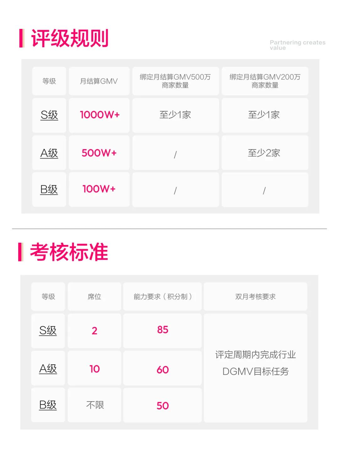 為了確保運營服務商隊伍的專業性與競爭力,小紅書電商實施了“量身篩選+動態考核”的分級機制。其中,最高級別的S級服務商需達到單月結算GMV超過1000萬,并綁定相應數量及標準的商家數,而A級和B級的考核指標則逐級遞降。