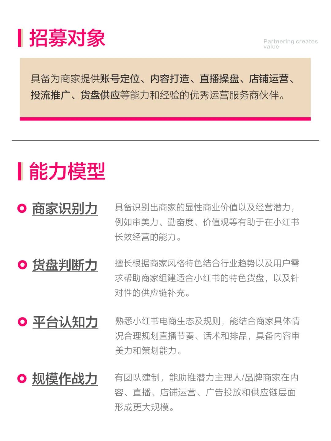 根據小紅書電商發布信息顯示,本次招募的是能夠為商家提供在賬號定位、內容打造、直播操盤、店鋪運營、投流推廣、貨盤供應等能力和經驗的優秀運營服務商伙伴。