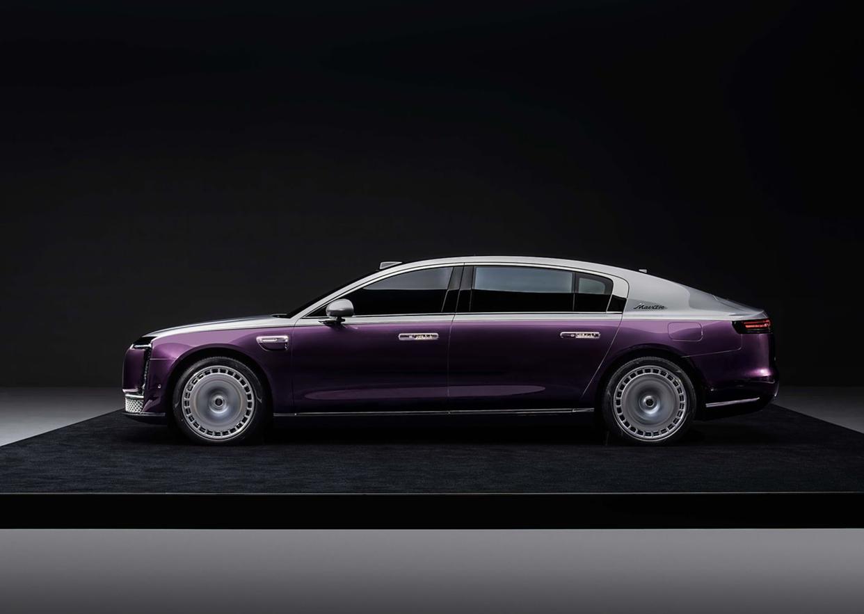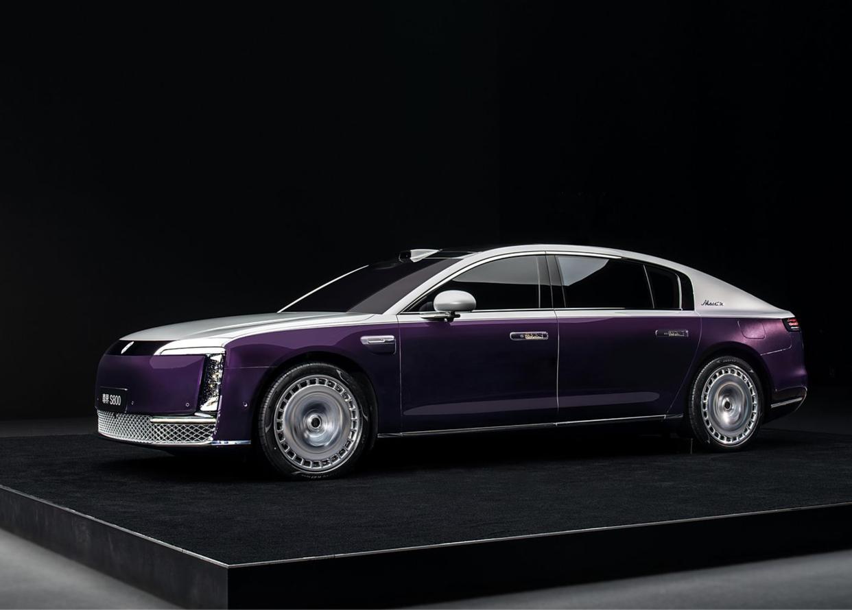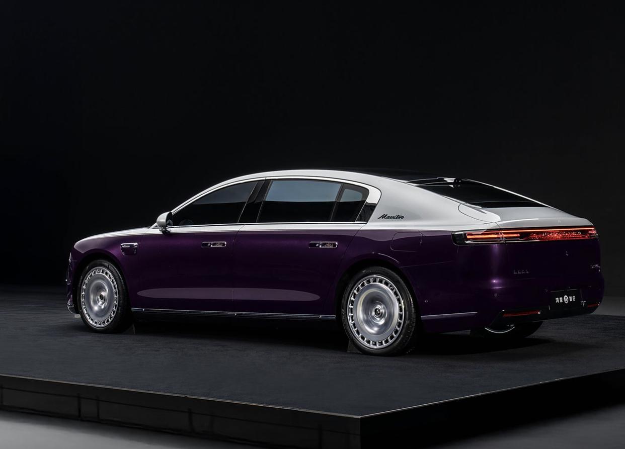 尊界S800,這款車是華為與江淮合聯合打造的尊界品牌(MAEXTRO)旗下的首款車型。外觀設計層面,尊界S800前臉依舊采用了封閉式格柵設計,前艙蓋十分扁平化,黑色的貫穿式裝飾面板搭配著中間可發的車標Logo,兩側日行燈采用了兩條平行設計的LED光帶,位置則在兩側直立式導流槽的上沿和下端,直立式導流槽內部則加入了上下排列的LED遠光燈和LED近光燈,點亮后的照明效果也會更加出色。根據動力的不同,還采用了兩套進氣口,增程版車型采用橫向貫穿裝飾,而純電動版車型則會采用網狀樣式。車尾采用溜背式誰家,貫穿式的尾燈加入了黑色的燈罩,內部同樣融入了“璀璨星河”燈光元素,將高級感拉滿。呼應了前臉,后保險杠的設計也更加簡約、時尚。