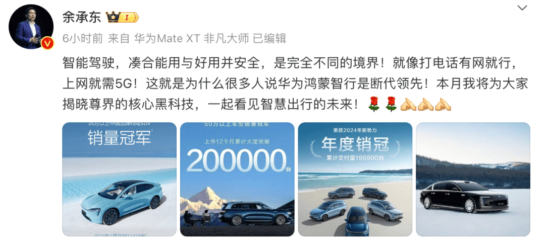 值得一提的是,對于這波全民智駕的浪潮,業內也有不同的聲音。比如余承東就在朋友圈表示,普及基礎駕駛輔助值得表揚,但混淆高階智駕概念不合適。