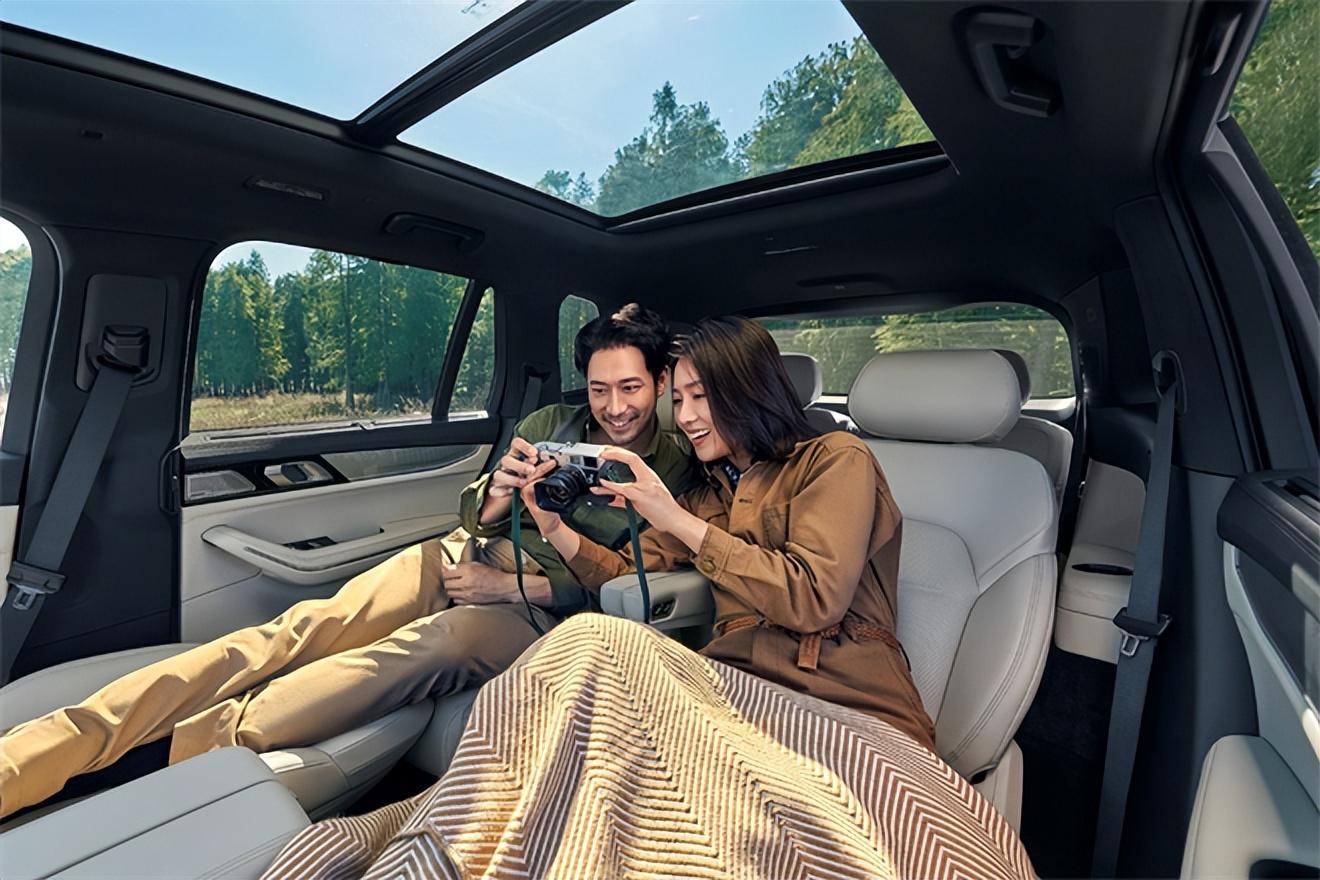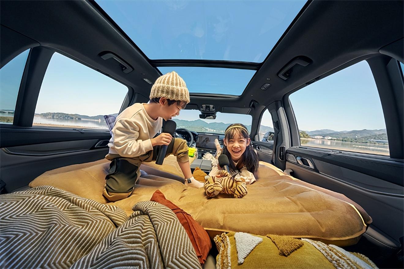 新09 EM-P的空間布局非常靈活,主副駕頭枕取出,一排放倒,可與二排連成1.8米沙發床,午休小憩更舒適。如果是自駕出游、露營,還可以將一排二排座椅都放倒,則可與三排座椅連成2.3m舒適頂奢大床,一家人躺著休息,舒適又愜意。