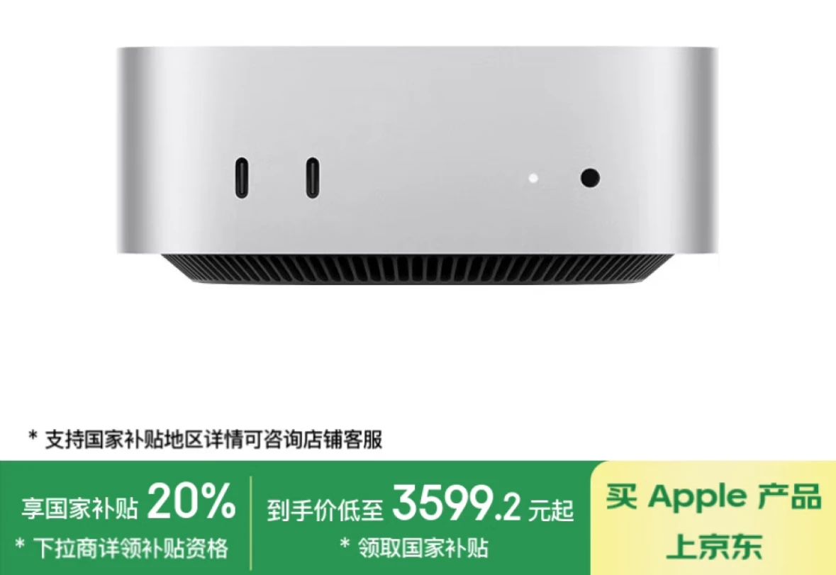 M4 Mac mini,巧的是這臺(tái)小電腦的定價(jià)也是 4499 元起,但是在疊加 20% 的國補(bǔ)之后,只要 3599 元就能拿下。