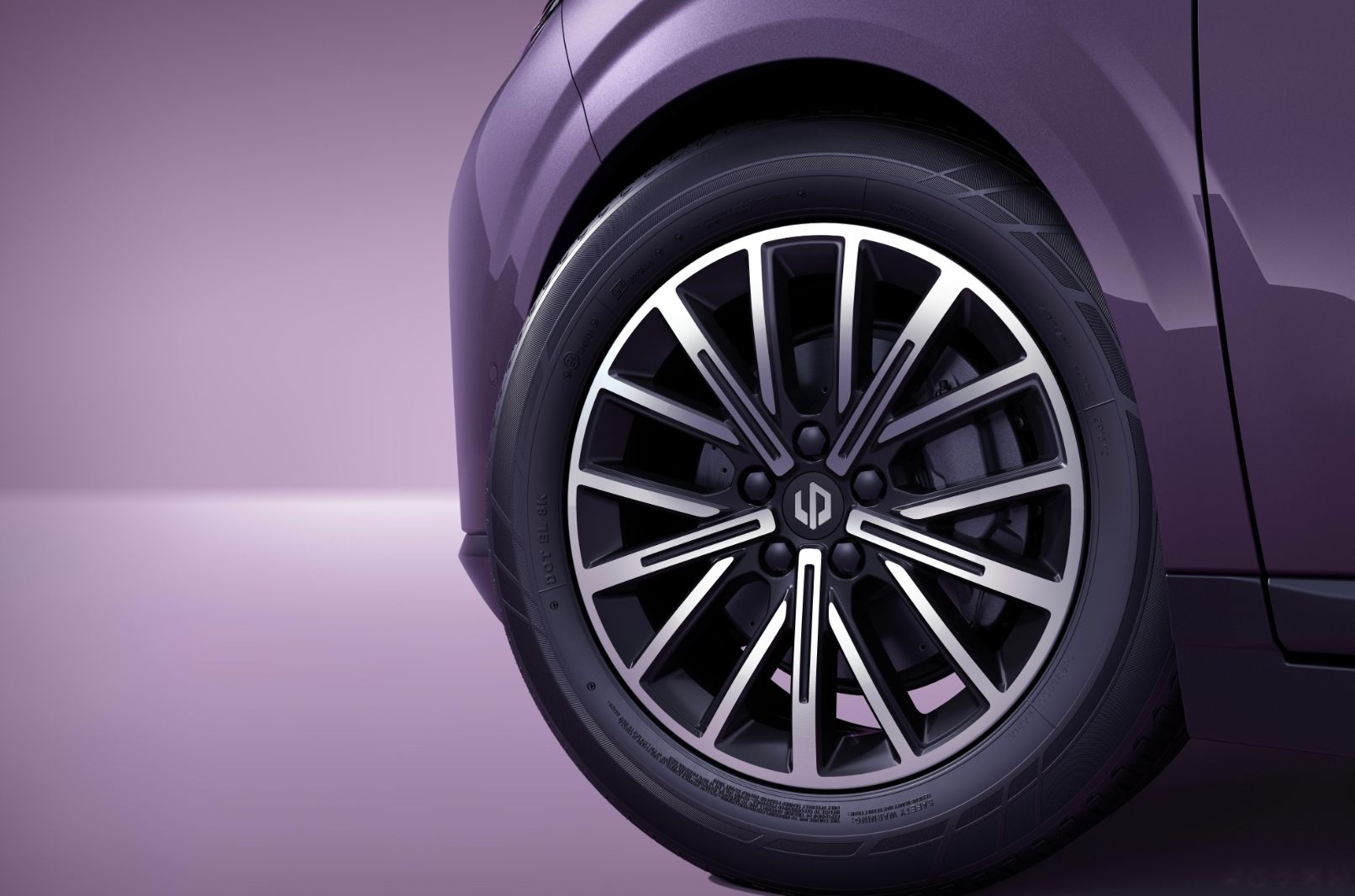 來到車側,零跑B10在葉子板上采用了黑色的面板以及延伸到車門的筋線設計,這樣的設計加強了車側的立體感,同時在視覺上降低了車身的厚度。同時新增了一款雙色切削的輪轂設計,更加凸顯出高級感。