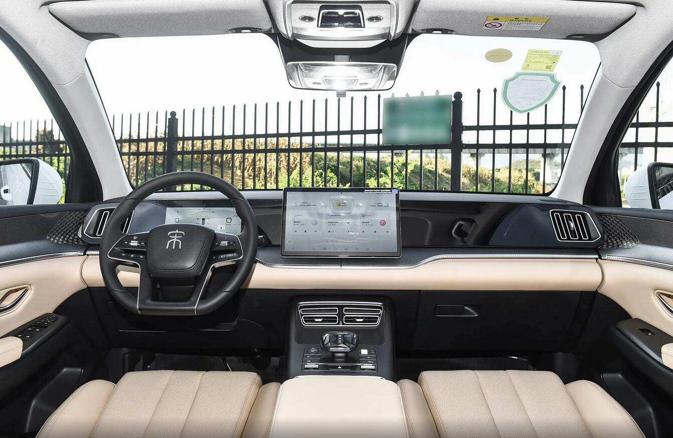 新款宋Pro DM-i的中控臺(tái)區(qū)域大改,中央扶手箱位置與前中控臺(tái)呈現(xiàn)垂直對(duì)稱式設(shè)計(jì)。新車換裝平底四幅式多功能方向盤,并配備貫穿式黑色飾板和內(nèi)嵌式儀表屏,搭配懸浮式中控大屏。車內(nèi)大面積采用淺棕色材質(zhì)包覆,裝配了環(huán)繞式氛圍燈。