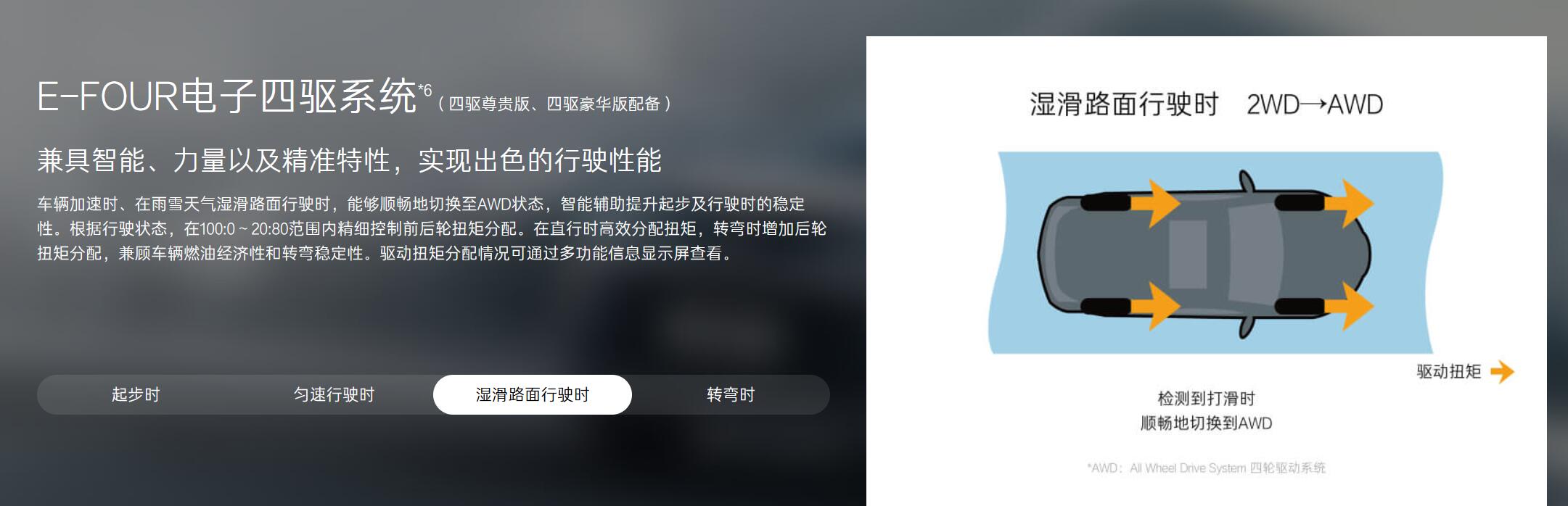 對于喜歡戶外探險的家庭來說,四驅豪華版和四驅尊貴版的E-Four四驅電子系統無疑是一大亮點。其四驅動力50:50的分配,確保了車輛在復雜路況下的穩定性,無論是濕滑路面還是崎嶇山路,都能輕松應對。同時,前輪動力100:0的前驅模式,在保證車輛通過性的同時,也帶來了出色的燃油經濟性,為長途旅行節省成本。而后驅動力為主20:80的后驅模式,則提升了車輛的操控靈活性,讓駕駛者能夠更加自如地應對各種路況挑戰。