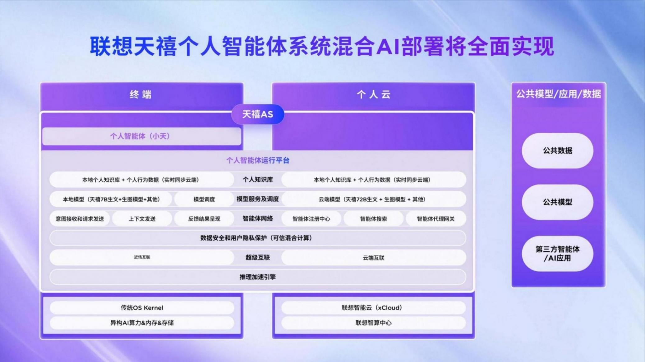 聯(lián)想集團高級副總裁、中國消費業(yè)務群總經(jīng)理張華透露,天禧AS將持續(xù)升級,今年5月,聯(lián)想創(chuàng)新科技大會TechWorld上,天禧AS將首發(fā)基于個人云部署的DeepSeek大模型。他表示:“屆時聯(lián)想天禧AS,在端側個人大模型、個人云大模型、公有云大模型,全面深度融合DeepSeek。聯(lián)想天禧AS將實現(xiàn)創(chuàng)新的混合式AI部署,聚焦推動個人智能和企業(yè)智能的普惠。”這一混合式AI架構將整合公有云大模型的能力,結合異構算力、數(shù)據(jù)安全,及全棧解決方案,實現(xiàn)關鍵AI場景應用,加速落地并規(guī)模化。