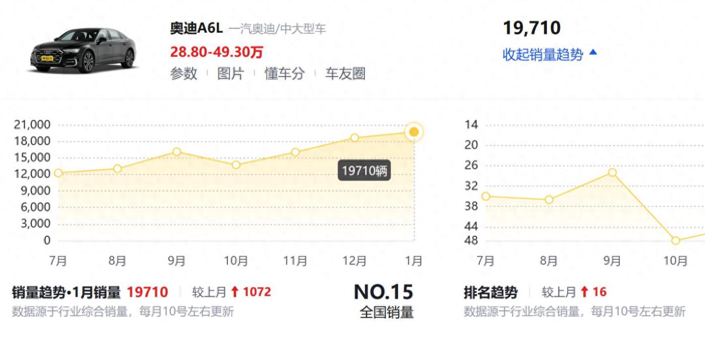 最近,全新奧迪 A6L 的亮相迅速吸引了大眾目光,消費者和媒體都在紛紛揣度外觀與內飾的革新方面。當前款 A6L 降價后,銷量顯著攀升,在 2025 年 1 月,銷量成功沖破 19710 臺,這一佳績使其在競爭白熱化的市場中嶄露頭角。