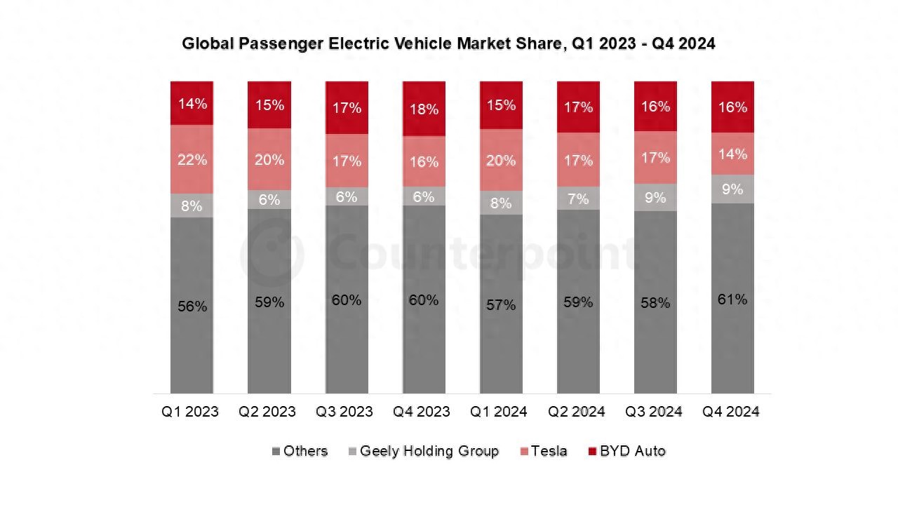2 月 26 日消息,市場調查機構 CounterPoint Research 昨日(2 月 25 日)發布博文,報告稱 2024 年第 4 季度全球電動汽車市場格局發生重大變化,比亞迪汽車銷量超越特斯拉,登頂全球純電汽車品牌榜首。