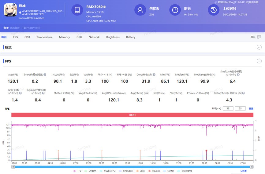可以看到,真我Neo7 SE開啟超級幀率功能后,連續(xù)游玩30分鐘《原神》平均幀率也能穩(wěn)定在120,全程滿幀操作,僅在部分戰(zhàn)斗場景會有微小卡頓。