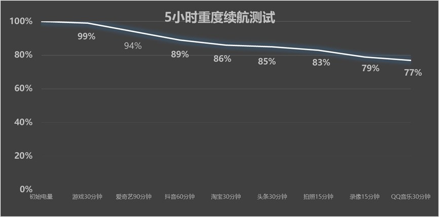 來看實際測試,我們對真我Neo7 SE進行包含游戲、視頻、拍攝等環(huán)節(jié)的5小時重度續(xù)航測試,實際結果如下圖所示: