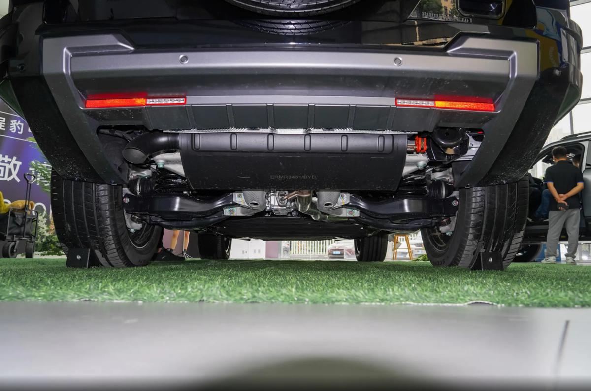 方程豹豹8的車尾則同樣充滿了硬派SUV的設計元素,尾窗采用了平直化的設計,并且與熏黑的尾柱形成了連通式的效果,后尾門采用了側開方式,并在中部配有外掛式的備胎,粗壯的支架呈現出較強的力量感,而在后包圍區域,單獨的外凸杠體造型厚重,呼應車頭的上揚包覆也兼顧了尾部的離去角表現。