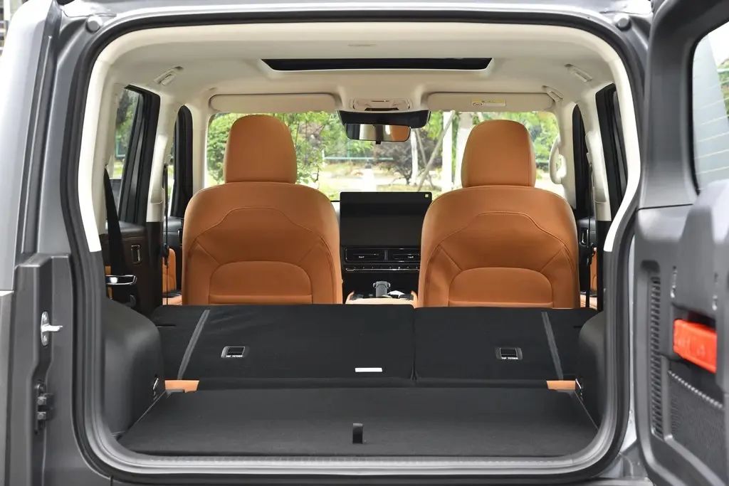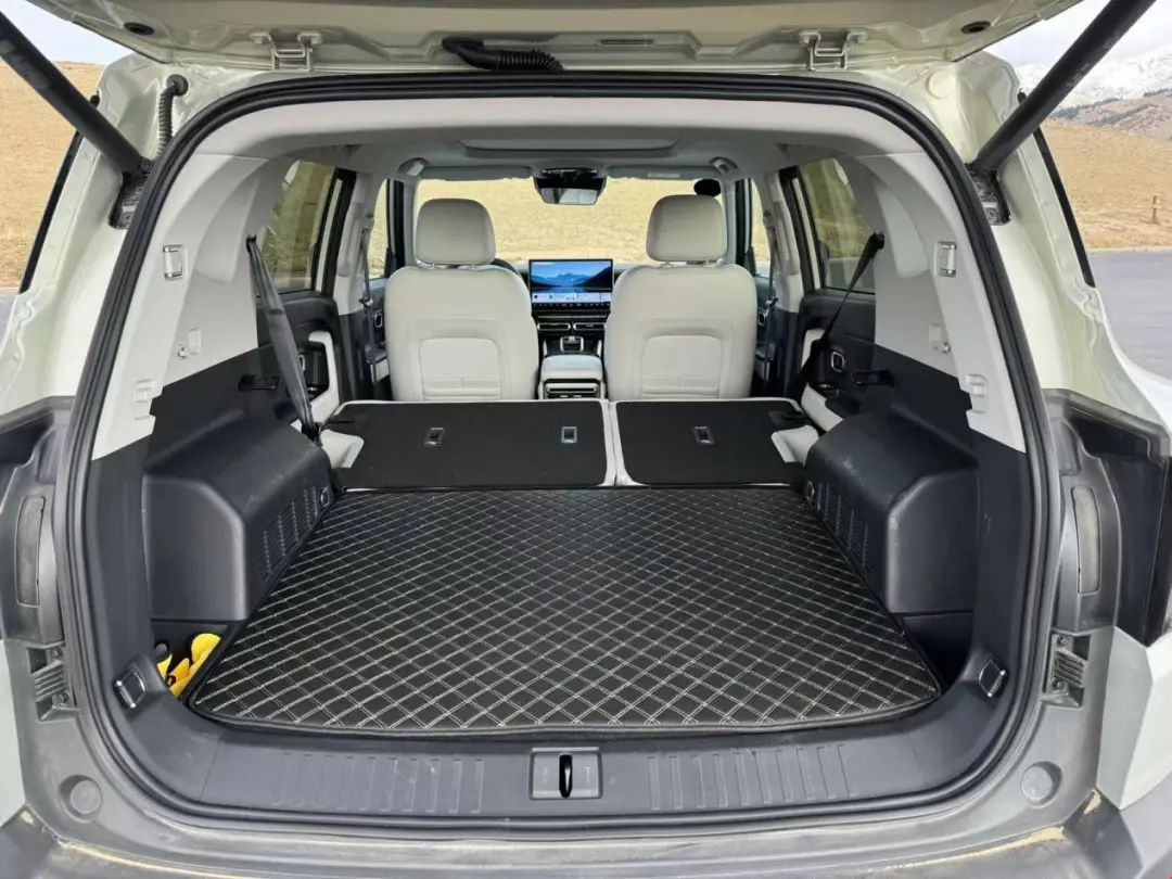 山海T1把后排座椅放倒后,可形成2米縱深的純平大床空間,后備箱還配備45L下沉式儲物空間。