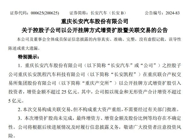 正是在這樣的背景下,長(zhǎng)安汽車12月18日發(fā)布的一則公告,再次點(diǎn)燃了業(yè)界的熱情。公告宣布,其控股子公司重慶長(zhǎng)安凱程汽車科技有限公司(以下簡(jiǎn)稱“長(zhǎng)安凱程”)計(jì)劃通過(guò)公開掛牌方式增資擴(kuò)股,引入不超過(guò)25億元人民幣的資金,旨在進(jìn)一步加速其在新能源商用車領(lǐng)域的布局,搶占數(shù)智化商用車的先機(jī)。