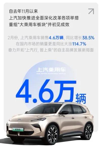 • 上汽乘用車2月份銷售4.56萬輛(另有說法為4.6萬輛),同比增長38.5%,在國內市場的銷量更是實現了同比114.7%的大幅增長。