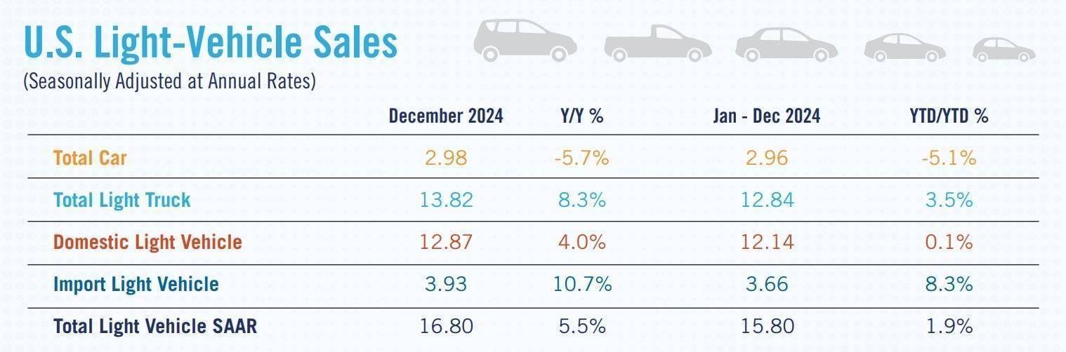 對于2024年的全年銷量,數(shù)據(jù)也給出了積極的反饋。實際銷量達到了1585萬輛,這一數(shù)字超出了美國汽車經(jīng)銷商協(xié)會此前預(yù)期的1570萬輛,表明市場對汽車的需求依然強勁。