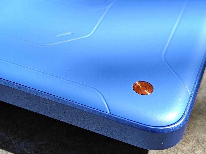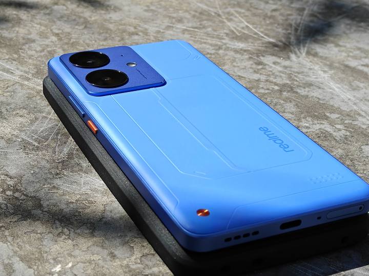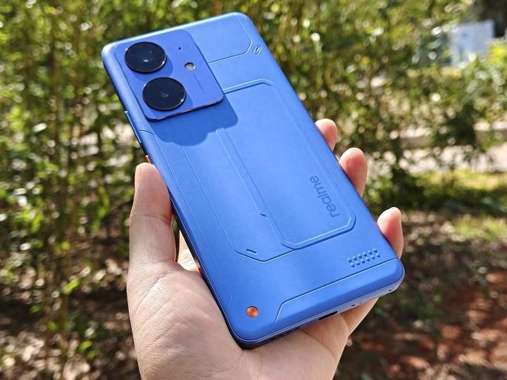 真我Neo7 SE提供了三種配色:白翼戰(zhàn)神、蒼藍(lán)機(jī)甲和暗鎧鐵騎。我們拿到的是蒼藍(lán)機(jī)甲版本,藍(lán)色涂裝+硬朗線條,背板左下角的“信念之釘”設(shè)計,瞬間讓整機(jī)有了機(jī)甲戰(zhàn)士的既視感。