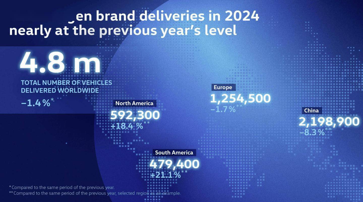 從大眾汽車公布的全球交付數據來看,公司在不同地區的業績呈現出明顯的差異。在歐洲市場,大眾汽車交付了125.45萬輛汽車,同比下降1.7%;而在南美洲市場,交付量則達到了47.94萬輛,同比增長21.1%;在北美洲市場,交付量為59.23萬輛,同比增長18.4%;在中國市場,盡管遭遇了8.3%的同比下降,但大眾汽車仍交付了219.89萬輛汽車。