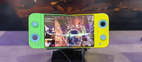 相比之下,三星展位上的可折疊游戲掌機顯得更加實用。它看起來有點像時尚版的Nintendo Switch,中間有一個鉸鏈,允許設備對折。兩側設有搖桿,關閉時可以整齊地收納進一個圓形凹槽中。