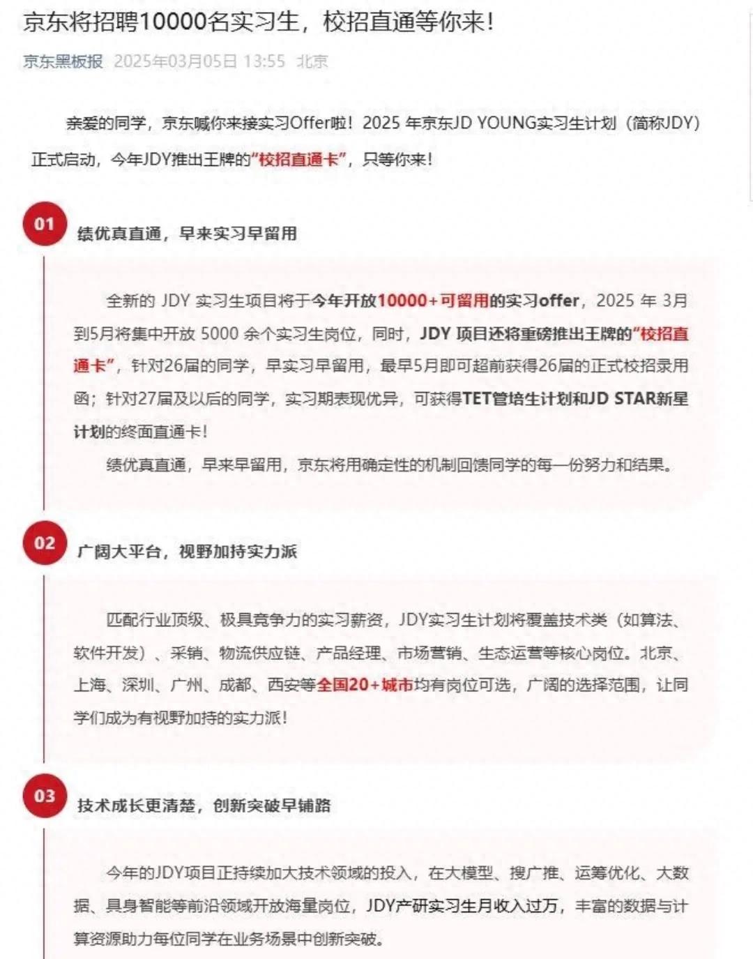 首頁 > 智駕游記 > 京東出王炸!應屆生:月薪過萬還包分配?2025最炸實習生計劃曝光