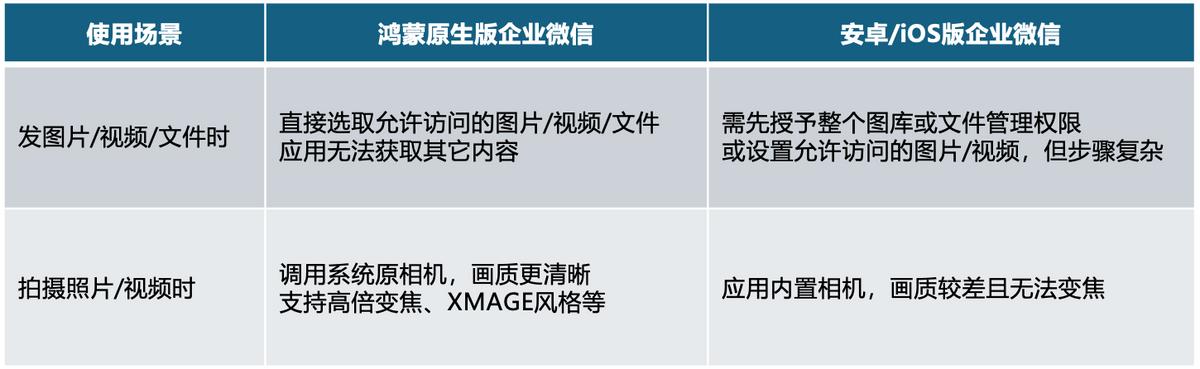 除了原有功能外,鴻蒙原生版企業微信還帶來了一些創新功能,在使用體驗上甚至超越了安卓和iOS版本。比如,在安卓和iOS版本上發送圖片、視頻或文件時,需要授予應用訪問整個圖庫或文件管理的權限,這無疑增加了隱私泄露的風險。而在鴻蒙原生版企業微信上,得益于HarmonyOS NEXT的全新安全訪問機制,應用只能訪問你授權的數據,真正做到“隱私安全,由你掌控”。