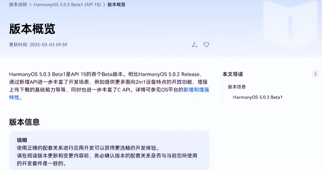 然而,細心的用戶可能會注意到,盡管這次更新帶來了諸多新功能和優化,但API版本仍然停留在14而未升級至15。根據華為開發者官網的最新信息,HarmonyOS 5.0.3 Beta1已經開始測試API 15。