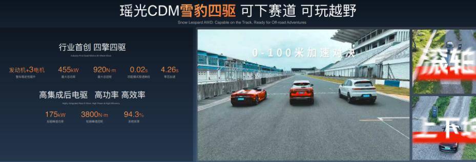 性能方面,奇瑞推出混動專用 2.0TGDI發動機,能夠實現280kW的功率,全球混動行業最高電機轉速24000rpm,遠超行業主流,讓每一瓦特 都燃燒你的激情。瑤光CDM-S電四驅搭載了M3X超混平臺,其最大總功率達到了455kW,最大總扭矩920N·m,零百加速僅4.26秒,既可下賽道,還可玩越野。