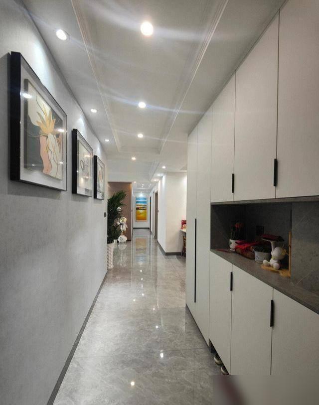 玄關(guān)處一排無拉手鞋柜,底部留空放常穿鞋,墻上掛著溫馨的裝飾畫——沒有為了“高級感”做復雜造型,卻把“每天換鞋不用彎腰”“進門能被溫暖擊中”的需求刻進了設計里。這種“實用主義”,恰好踩中了2025年裝修的核心趨勢:現(xiàn)代簡約風強調(diào)的“隱形收納”“空間擴容”,在這兒被玩明白了——通頂柜藏起所有雜亂,墻面裝飾畫用最小成本提升氛圍感,比那些花里胡哨的“網(wǎng)紅玄關(guān)”實用十倍。