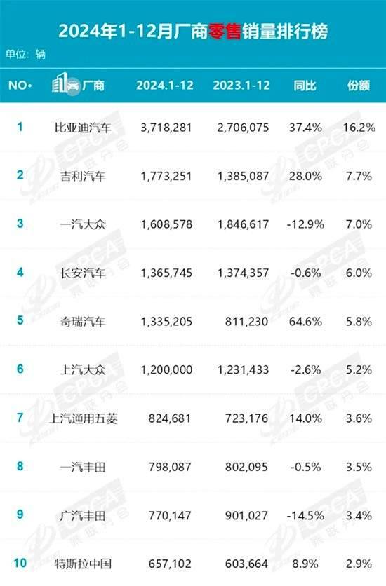 2024年車企銷量排行榜出爐:奇瑞擠進前五,特斯拉只能排第十