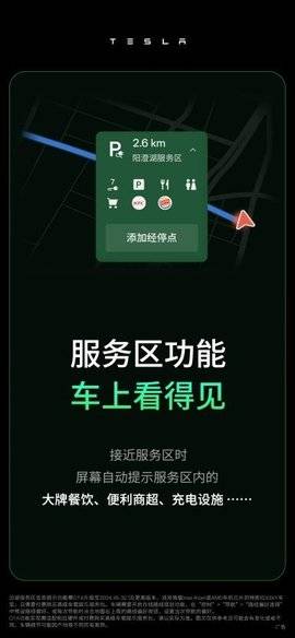 當然,作為車內使用頻率最高的功能,導航本次也得到了大幅提升。OTA后,特斯拉車輛新增路線偏好選擇,包括時間最快、擁堵最少、高速最多、收費最少,用戶可根據(jù)需求自行選擇最常用的導航路線門類。在導航接近高速服務區(qū)時,特斯拉車機屏幕還會自動提示服務區(qū)內的大牌餐飲、便利商超、公共廁所、充電設施,極大方便車主判斷是否有經停當前服務區(qū)的需求。