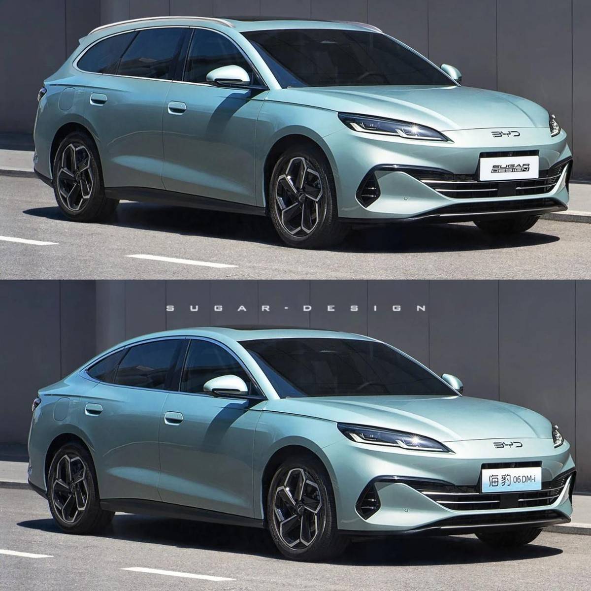 結合諜照和大神所繪制出來的渲染圖來看,海豹06旅行的外觀基本沿襲了三廂版車型的設計,而區別則在于旅行版的車尾多了一個性感的“大屁股”,配上花瓣樣式的輪輞,整個看起來還是比較協調的。