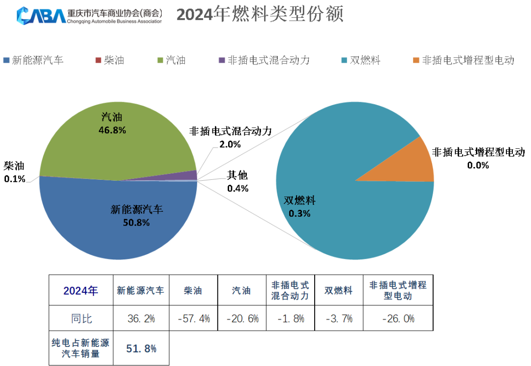 從2024年銷售車型的燃料類型來看,重慶市場燃油車銷量占比為46.8%,新能源汽車銷量占比達到50.8%,其中純電車型占新能源汽車銷量的51.6%。