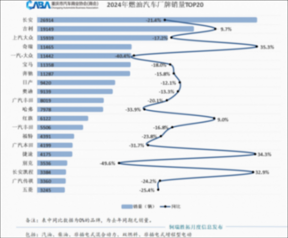 看完了重慶整體市場外,再了解一下重慶市場燃油車品牌銷量情況,會發現過去的2024年,自主品牌及車型表現比較平穩,而合資品牌及車型走勢低迷,市場依然嚴峻。