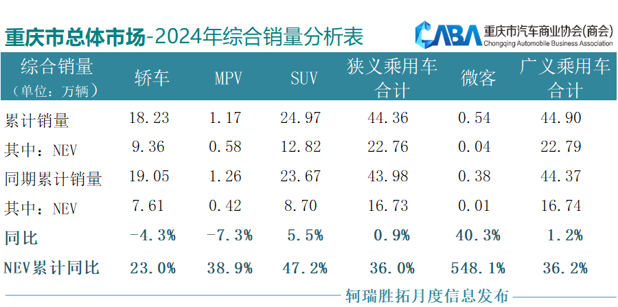 從整體表現來看:盡管經受了“價格戰”沖擊,但重慶車市在2024年的整體表現值得肯定。無論是燃油車的表現、還是新能源市場的發力,都預示著重慶車市具備很好的潛能。