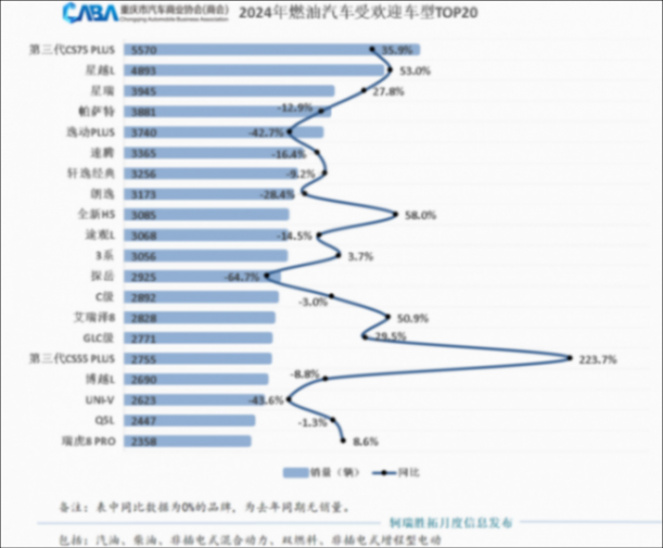 在重慶2024年燃油車的銷量排名中,第三代CS75PLUS、星越L、星瑞毫無懸念地居榜單前三,同比增長分別為35.9%、53.0%、27.8%。看來在過去的2024年,自主燃油車憑借出色的產品依然吸引了不少追消費者。