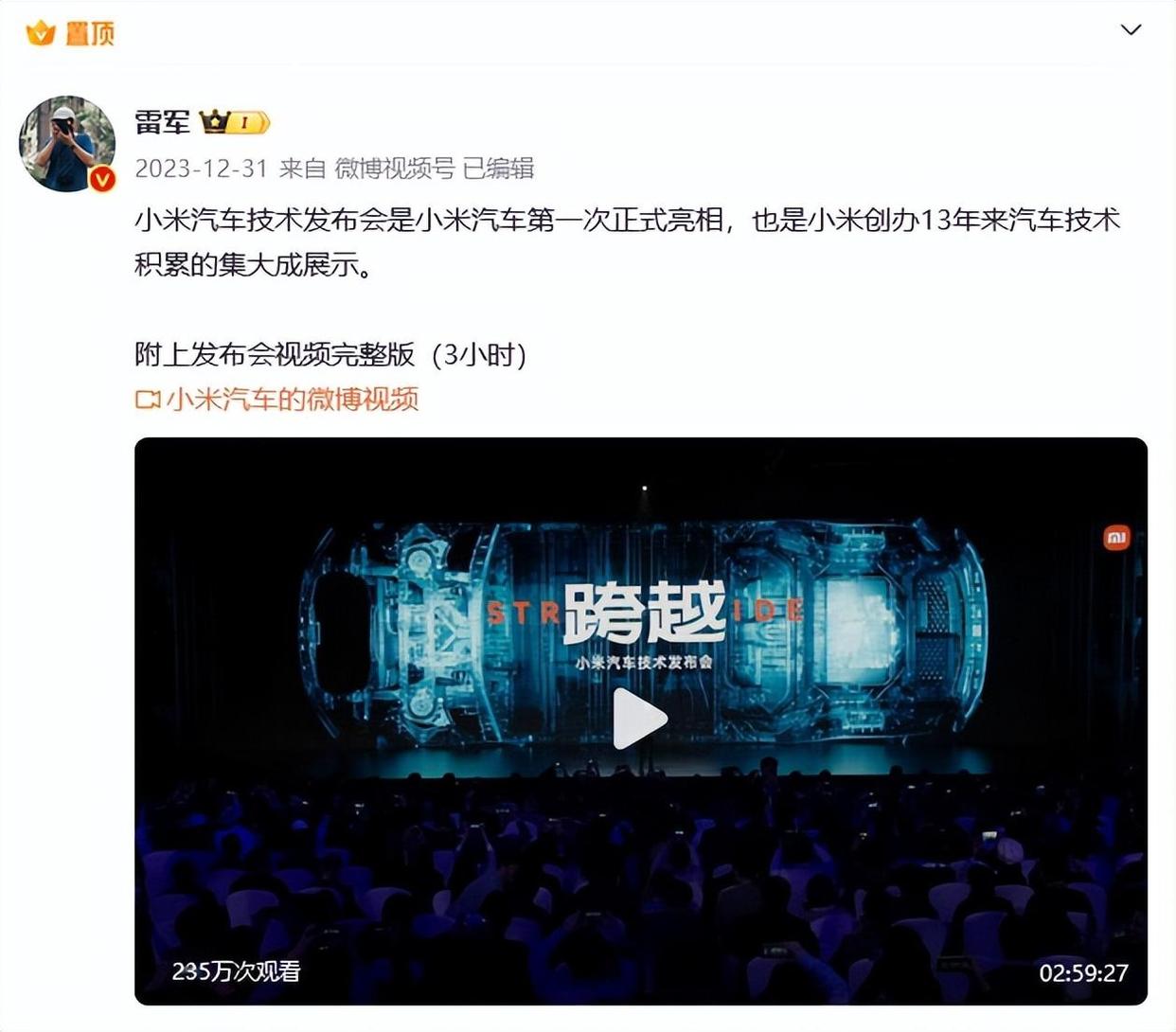 發布會后,雷軍多次在公開賬號發文宣傳小米汽車,其微博置頂內容就是關于小米汽車發布會。